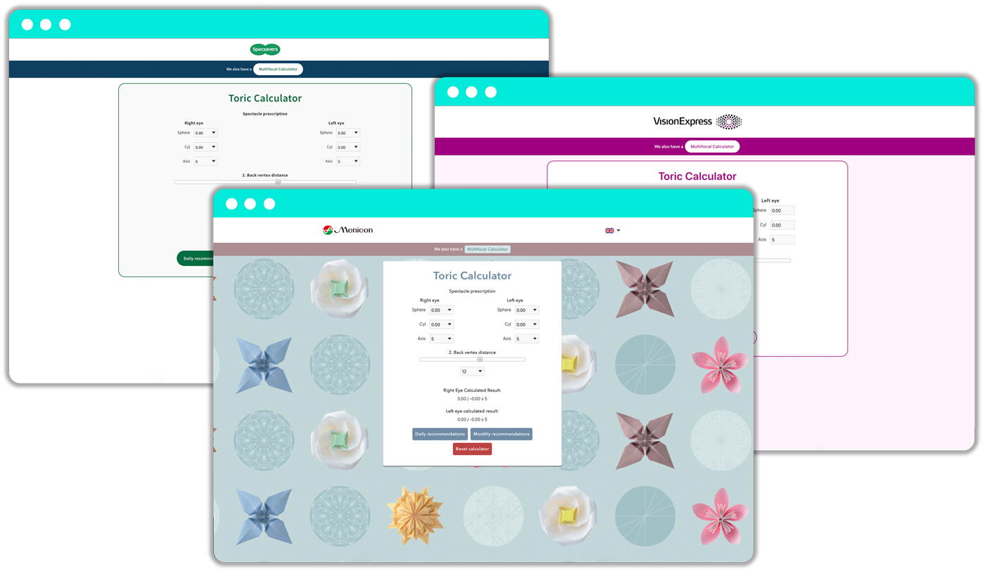 Menicon sell their lenses to Specsavers and Vision Express. As a result I was also asked to rebrand and reskin the calculator for these two contact lens sellers.